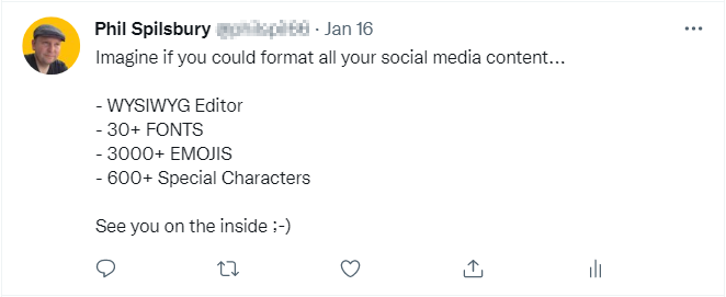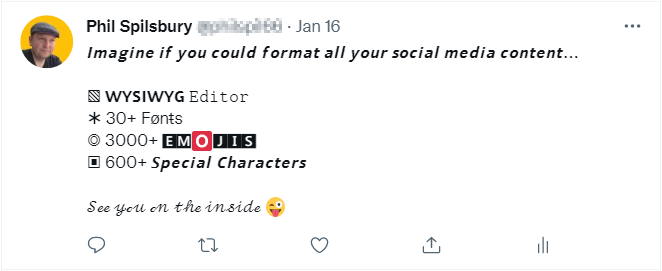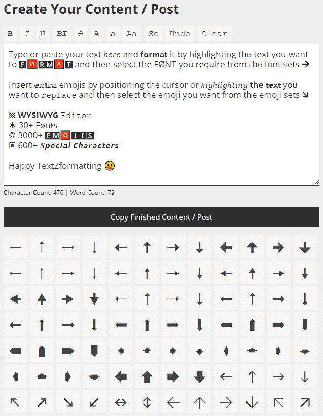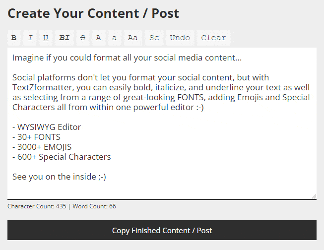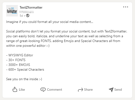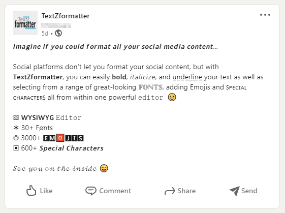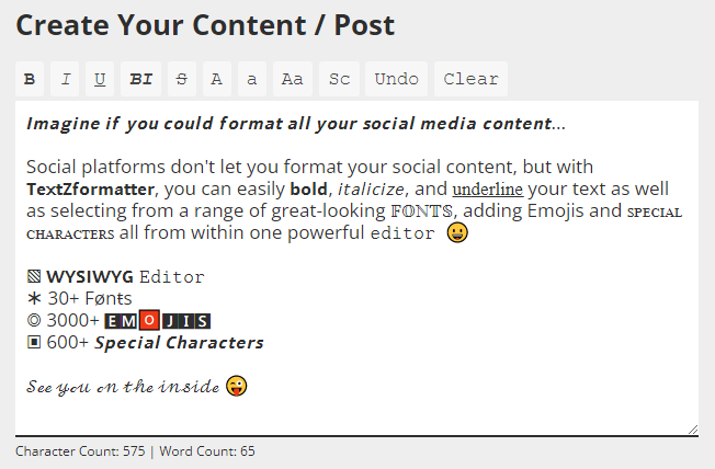Social platforms like LinkedIn, Twitter or Facebook don't let you format your social media content, but with TextZformatter, you can easily bold, italicize, and underline your text as well as selecting from a range of great-looking 𝓕𝓸𝓷𝓽𝓼, Emojis πŸ˜€, Art (β—•β€Ώβ—•) and Characters β–£ all from within one powerful unicode text editor.