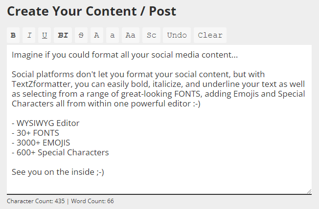 TextZformatter comes with an easy to use Unicode Text Editor that lets you create your social content and format the text, add fancy fonts and a whole lot more!