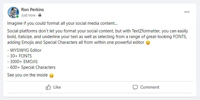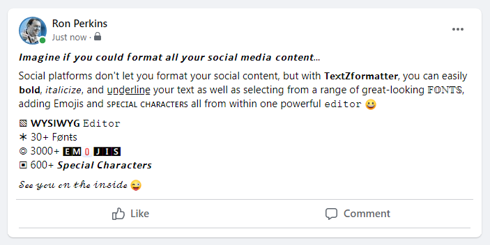 You can use TextZformatter to create amazing social media profiles, incredible looking posts and even use it to make your comments stand out and it all works with all your favorite social media platforms!